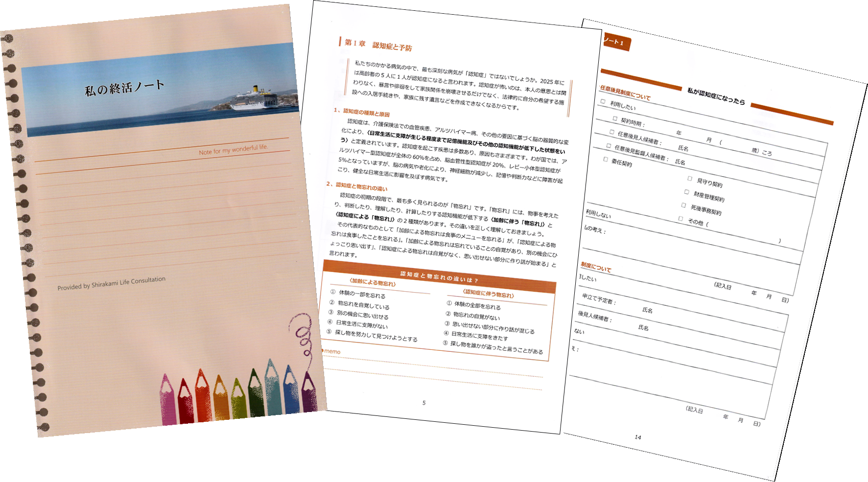 使用するノートは市販されているノートで構いませんが、しらかみ終活相談所でも専用のエンディングノートを準備していますので、そちらを利用していただいても結構です。