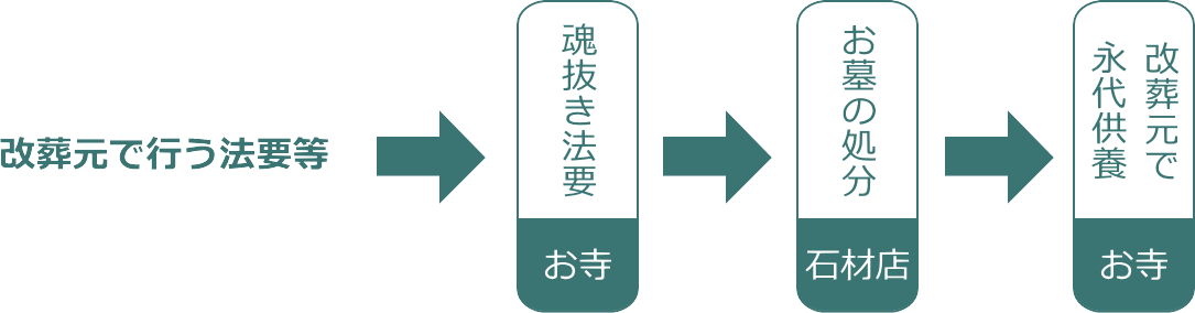 改葬元の菩提寺で行う法要等の流れは下図のようになります。例示の場合は改葬元のお寺で永代供養となっていますが、お骨を移動して他の墓地へ改葬する場合は、改葬先での法要や費用が必要になりますが、ここでは割愛します。